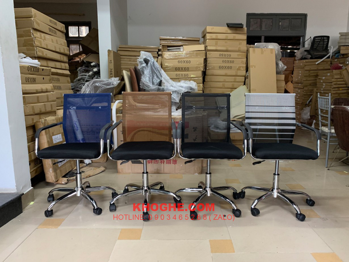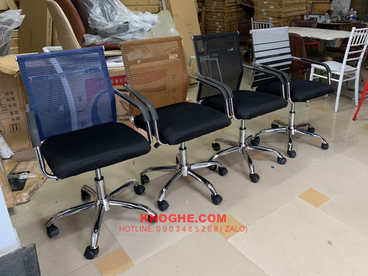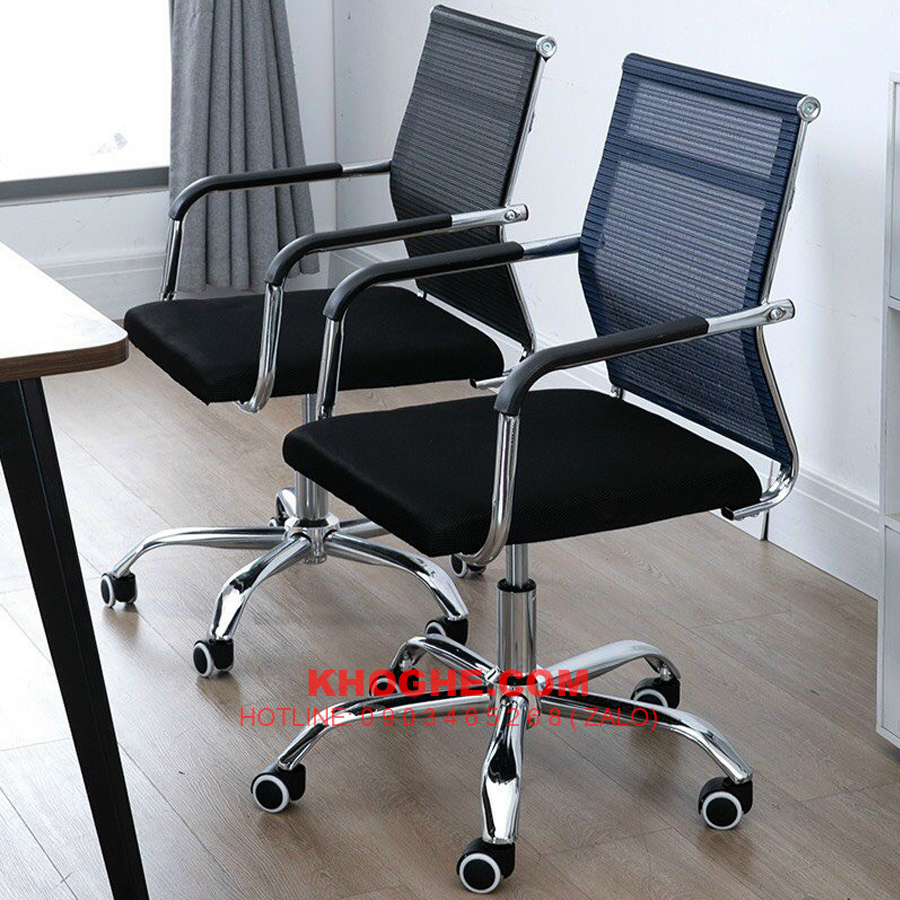 - Chất liệu : Mặt nệm mút, lưng lưới sợi Poly tổng hợp kết hợp chân đế xoay thép mạ crom có bánh xe